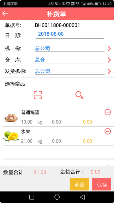App端分销连锁配送功能:手机端补货申请,手机端调拨配送,内部往来分销等。